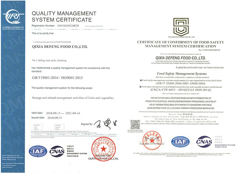 Qixia Defeng Food Co., Ltd. has passed the following certifications